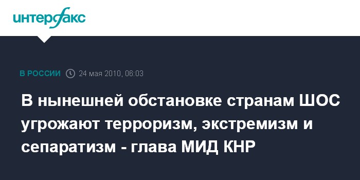 "В мировой обстановке и в обстановке в регионах заметно растет число факторов неопределенности и нестабильности, для полного восстановления мировой экономики необходимо время. Стабильности и безопасности стран региона (на пространстве ШОС - "ИФ") угрожают "силы трех зол" (терроризм, сепаратизм и экстремизм)", - сообщил министр, комментируя свое участие в состоявшемся в Ташкенте заседании Совета министров иностранных дел стран-членов ШОС.