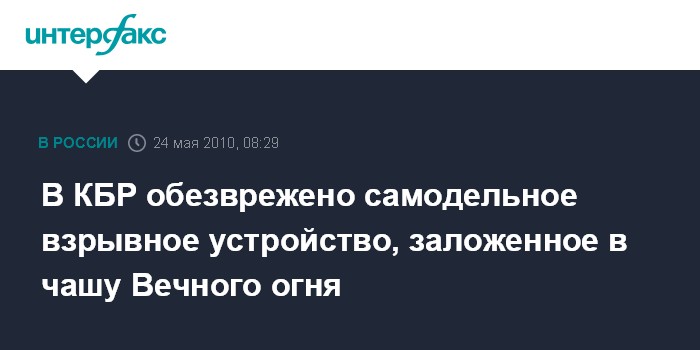 Москва. 24 мая. INTERFAX.RU - Самодельное взрывное устройство (СВУ) обезврежено саперами в городе Тырнаус (Кабардино-Балкария), которое боевики установили в чаше Вечного огня, погасив его, сообщили агентству "Интерфакс-Юг" в правоохранительных органах Эльбрусского района республики.