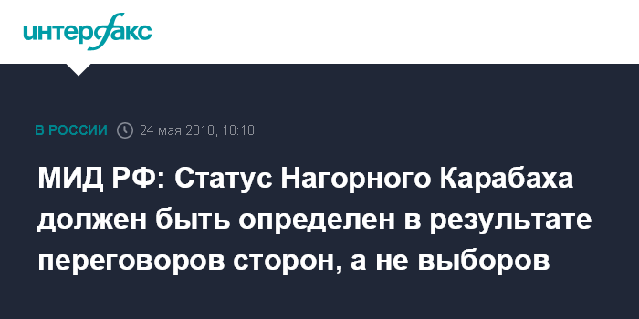 Москва. 24 мая. INTERFAX.RU - В Москве считают, что статус Нагорного Карабаха не может быть определен путем выборов в этом регионе, заявил официальный представитель МИД РФ Андрей Нестеренко.