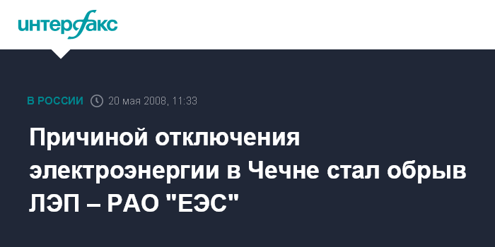 Москва. 20 мая. INTERFAX.RU - Причиной аварии, приведшей к отключению электроэнергии в более чем 30 районах Чечни, стал обрыв линии электропередачи в высокогорных районах республики, сообщили ""Интерфаксу" в РАО "ЕЭС России". "Всю ночь шел обход линии. Место отрыва нашли и сейчас ведутся работы по восстановлению ЛЭП ", - сказал собеседник агентства.