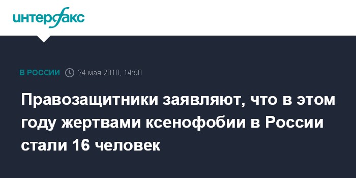 Москва. 24 мая. INTERFAX.RU - 16 человек погибли в России с начала года в результате преступлений на почве ксенофобии и национальной нетерпимости, заявили правозащитники.