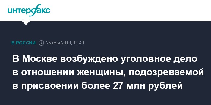 Москва. 25 мая. INTERFAX.RU – Уголовное дело возбуждено в отношении 58-летней неработающей москвички, которая, как считает следствие, украла мошенническим путем со счетов двух коммерческих фирм около 27,5 млн рублей, сообщил "Интерфаксу" источник в правоохранительных органах во вторник.