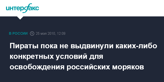 Москва. 25 мая. INTERFAX.RU – Нигерийские пираты, захватившие в Камеруне двух членов экипажа с судна "North Spirit", пока не выдвинули каких-либо конкретных условий для освобождения российских моряков, сообщила "Интерфаксу" во вторник официальный представитель российского профсоюза моряков Ирина Устюменко.
