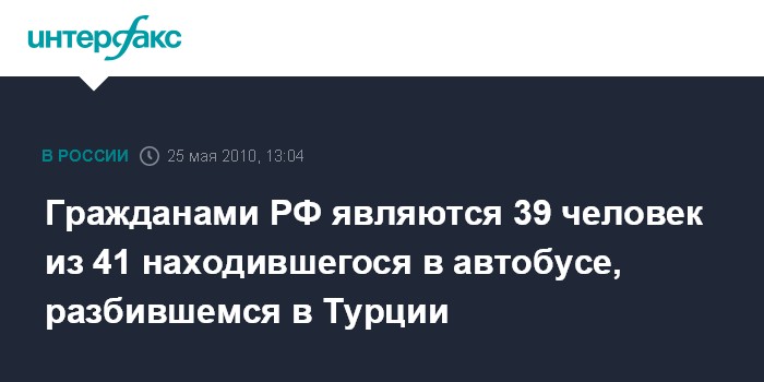 Москва. 25 мая. INTERFAX.RU - Из 41 человека, находившегося в разбившемся автобусе в Анталье, - 39 россиян и двое граждан Турции, сообщила журналистам замначальника Управления информации МЧС России Елена Чернова.
