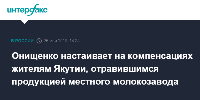 Москва. 25 мая. INTERFAX.RU - Роспотребнадзор рассчитывает добиться выплаты компенсаций жителям Якутии, которые в феврале заболели дизентерией после употребления молочной продукции с местного завода.
