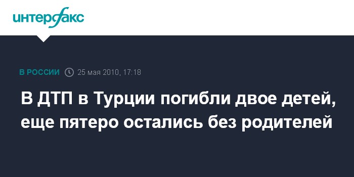 Москва. 25 мая. INTERFAX.RU - Двое малолетних детей (3 и 11 лет) погибли в результате ДТП, происшедшего в Турции во вторник, сообщила "Интерфаксу" исполнительный директор Ассоциации туроператоров России Майя Ломидзе. По ее словам, в результате трагедии еще пятеро детей остались без родителей.