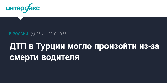 Москва. 25 мая. INTERFAX.RU - Причиной ДТП в Турции, в результате которого погибли россияне, могла стать остановка сердца водителя автобуса, сообщает во вторник вечером сайт туристической компании "Пегас Туристик".