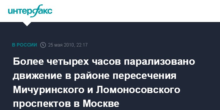 Москва. 25 мая. ИНТЕРФАКС - Гигантская пробка, образовавшаяся вечером во вторник на пересечении Мичуринского и Ломоносовского проспектов в Москве, не рассасывается уже четыре с лишним часа, сообщает корреспондент "Интерфакса".