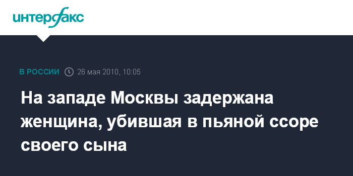 Москва. 26 мая. INTERFAX.RU – Уголовное дело по факту убийства возбуждено в отношении жительницы Западного округа Москвы, которая зарезала собственного сына, сообщил "Интерфаксу" источник в правоохранительных органах в среду.