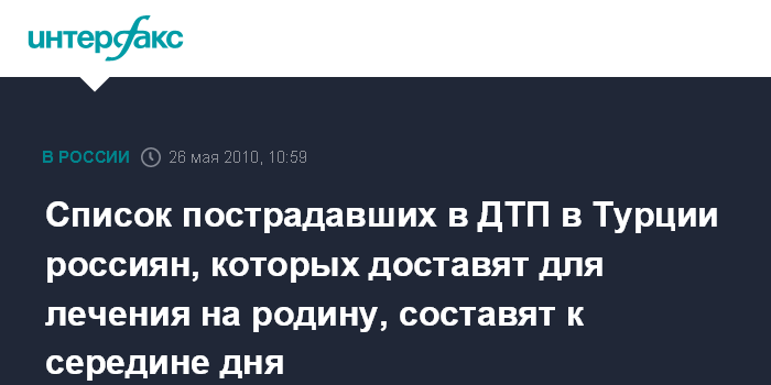 Москва. 26 мая. INTERFAX.RU – До 20 пострадавших в ДТП в Анталье российских туристов могут быть эвакуированы из Турции самолетом МЧС для прохождения дальнейшего лечения в России, сообщила в среду начальник Управления информации МЧС России Ирина Андрианова.