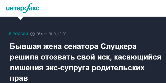 Москва. 26 мая. INTERFAX.RU – Известная предпринимательница и президент сети фитнес-клубов Ольга Слуцкер отзывает иск о лишении своего бывшего мужа, члена Совета Федерации РФ Владимира Слуцкера родительских прав, сообщил ее адвокат Руслан Коблев.