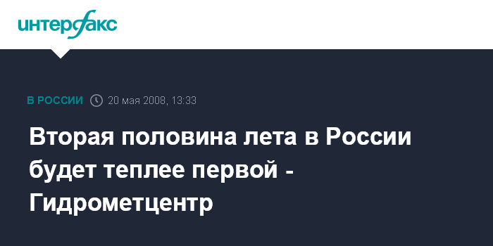 Москва. 20 мая. INTERFAX.RU - Hынешнее лето в России будет прохладнее прошлогоднего, заявил руководитель Гидрометцентра России Роман Вильфанд. "Температурный фон летом в целом по стране будет близок к обычным значениям. Hо температура будет ниже, чем в прошлом году", - сказал Вильфанд на пресс-конференции в Москве.