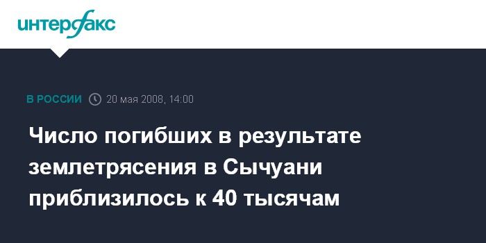 Пекин. 20 мая. INTERFAX.RU - До 39 577 человек увеличилось число жертв разрушительного землетрясения, которое произошло 12 мая в юго-западной китайской провинции Сычуань, говорится в сообщении на англоязычном открытом сайте официального агентства "Синьхуа".