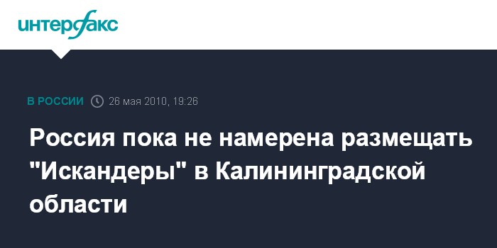 Москва. 26 мая. INTERFAX.RU - Россия пока не намерена размещать комплексы "Искандер" в Калининградской области в ответ на дислокацию на польской территории зенитно-ракетных комплексов "Пэтриот", заявил журналистам в среду высокопоставленный источник в МИД РФ в среду.
