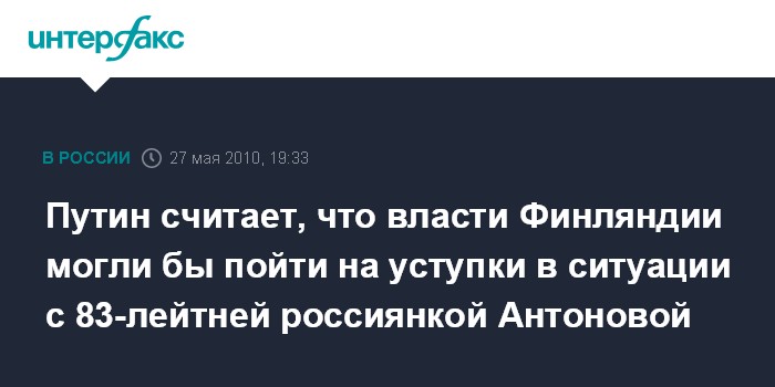 Москва. 27 мая. INTERFAX.RU – Премьер-министр РФ Владимир Путин считает, что Финляндия должна пойти навстречу 83-лейтней россиянке, которую собираются депортировать из-за просроченной туристической визы.