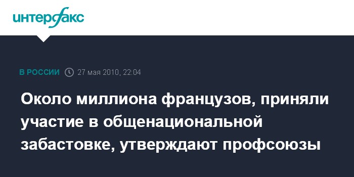 Москва. 27 мая. INTERFAX.RU – Примерно 1 млн жителей Франции приняли участие в четверг в общенациональной забастовке, чтобы выразить протест против проекта пенсионной реформы, объявили местные профсоюзы.