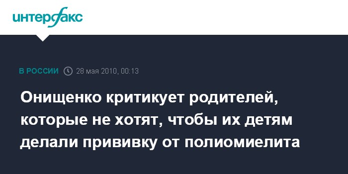 Г.Онищенко заявил, что родители сильно рискуют жизнью и здоровьем своего ребенка, отказываясь от того, чтобы ему своевременно сделали прививку против полиомиелита.