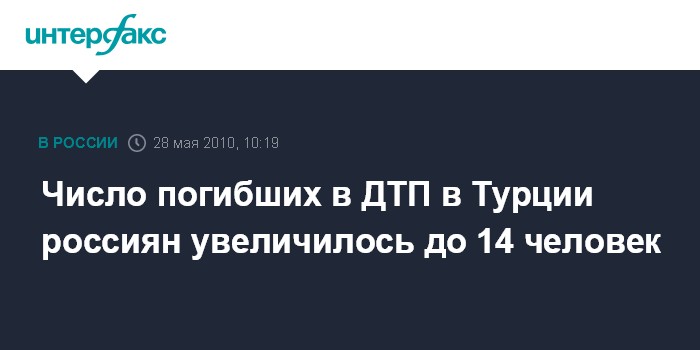 Москва. 28 мая. INTERFAX.RU - Российское консульство в Анталье подтверждает гибель в турецкой больнице еще одной российской туристки, пострадавшей в результате ДТП в минувший вторник. Как заявил "Интерфаксу" в пятницу по телефону российский консул в Анталье Мирджалол Хусанов, минувшей ночью скончалась еще одна пострадавшая. Таким образом, количество погибших увеличилось до 16 человек, среди которых - двое граждан Турции.