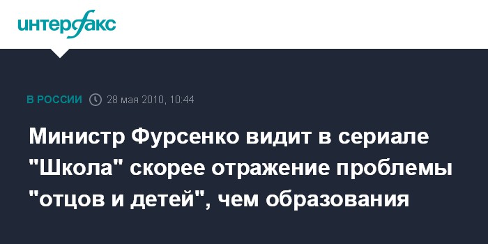 Москва. 28 мая. INTERFAX.RU - Министр образования и науки Андрей Фурсенко не считает телесериал "Школа" вредным, хотя в нем не всегда корректно отображались школьные проблемы. "Я не думаю, что он нанес большой вред. Кому-то, наверное, он был неприятен, для кого-то это было полезно - увидеть с другой стороны", - заявил Фурсенко "Интерфаксу", комментируя сериал. При этом, по мнению министра, сериал показал "одну из самых больших проблем - это, действительно, разобщенность поколений".
