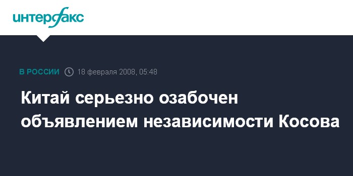 "То, что Косово 17 февраля в одностороннем порядке объявило о независимости, вызывает серьезную озабоченность у китайской стороны", - говорится в заявлении дипломата, размещенном на официальном сайте внешнеполитического ведомства КНР.