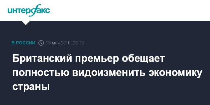 По его словам, экономика Великобритании достигла "критической точки" из-за ошибок предыдущих правительств. В связи с этим он выразил готовность "видоизменить экономику и вновь открыть Великобританию для бизнеса". В частности, Д.Кэмерон пообещал провести либерализацию экономики, сократить дефицит госбюджета, сохранить налоги на низком уровне и активно поддерживать британские предприятия.