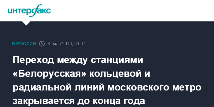 Москва. 29 мая. ИНТЕРФАКС - С 29 мая закрывается переход между станциями "Белорусская" кольцевой и радиальной Замоскворецкой линиями, сообщили "Интерфаксу" в пресс-службе столичного метро в среду.