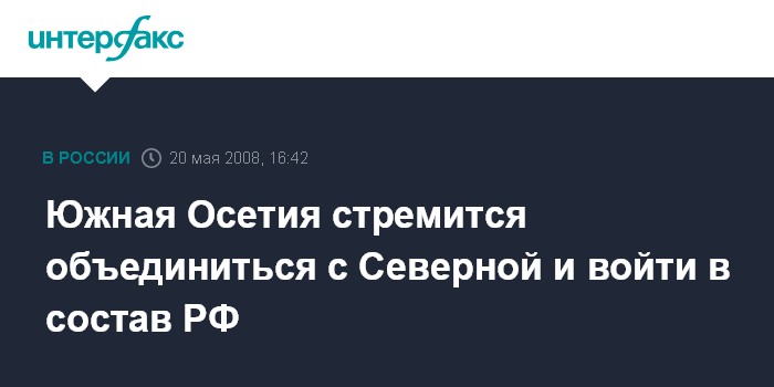 Москва. 20 мая. INTERFAX.RU - Южная Осетия стремится к объединению с Северной Осетией в составе России, заявляет президент Южной Осетии Эдуард Кокойты.
