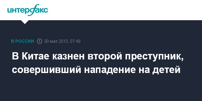 Пекин. 30 мая. ИНТЕРФАКС - В Китае приведен в исполнение смертный приговор в отношение преступника, который был приговорен к высшей мере наказания за нападение на детей детского сада, сообщили в воскресенье местные СМИ.