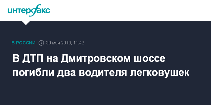 Москва. 30 мая. INTERFAX.RU - В Подмосковье в результате ДТП погибли два человека, сообщил "Интерфаксу" в воскресенье источник в правоохранительных органах. По предварительным данным, около 10 часов утра на 87-м км Дмитровского шоссе произошло столкновение двух автомобилей - "Лада-Калина" и "Дэу-Матис". В результате аварии оба водителя скончались на месте от полученных ранений.