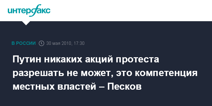 Путин никаких акций протеста разрешать не может, это компетенция местных властей – Песков