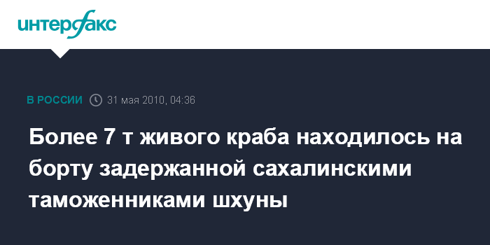 Южно-Сахалинск. 31 мая. INTERFAX.RU - Сахалинские таможенники 29 мая в территориальных водах РФ задержали рыболовную шхуну-нарушителя с живым крабом на борту, сообщил агентству "Интерфакс" пресс-секретарь Сахалинской таможни Юрий Гуршал в понедельник.