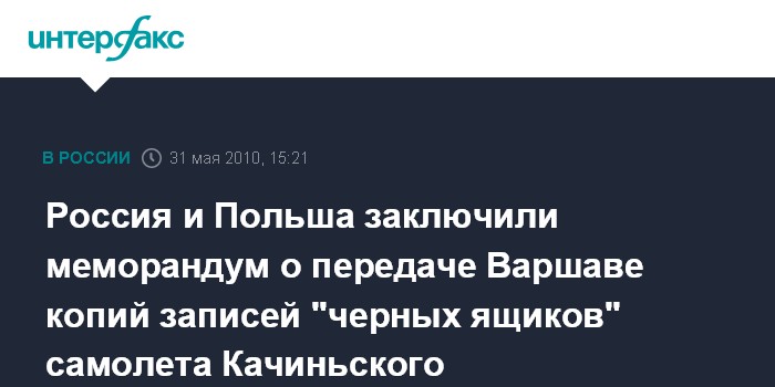 Москва. 31 мая. INTERFAX.RU - В понедельник в правительстве РФ был подписан меморандум о передаче польской стороне копий записей черных ящиков самолета президента Леха Качиньского. Документ подписали министр транспорта РФ Игорь Левитин, глава Межгосударственного авиационного комитета Татьяна Анодина и глава МВД и администрации Польши Ежи Миллер. Церемония подписания прошла в присутствии вице-премьера Сергей Иванова. Копии записей будут переданы в понедельник во второй половине дня в штаб-квартире МАК в Москве.
