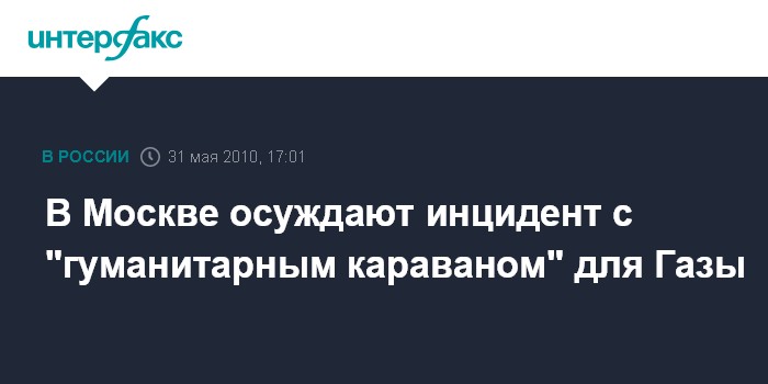 Москва. 31 мая. INTERFAX.RU - В Москве выражают осуждение в связи с инцидентом с "гуманитарным караваном" для Сектора Газа и заявляют о необходимости прояснить все обстоятельства произошедшего, говорится в сообщении МИД РФ, распространенном в понедельник.