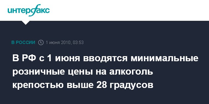 Москва. 1 июня. ИНТЕРФАКС - В России с 1 июня вводятся минимальные розничные цены на алкогольную продукцию крепостью более 28 градусов (за исключением водки). Соответствующий приказ Росалкогольрегулирования был зарегистрирован в Минюсте 13 мая этого года.