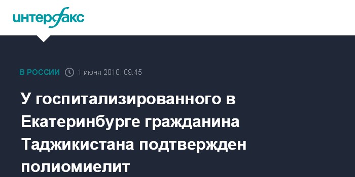 Москва. 1 июня. INTERFAX.RU - Лабораторно подтвержден диагноз "полиомиелит" у 19-летнего гражданина Таджикистана, госпитализированного в Екатеринбурге, сообщил и.о. главного санитарного врача Свердловской области Сергей Кузьмин во вторник на пресс-конференции в екатеринбургском пресс-центре агентства "Интерфакс-Урал".