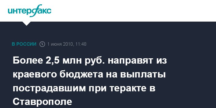 Москва. 1 июня. INTERFAX.RU - Власти Ставропольского края выделили 2 млн 630 тыс. рублей для выплат единовременного пособия пострадавшим и членам семей погибших в результате теракта в Ставрополе, сообщает во вторник пресс-служба краевого Минфина.