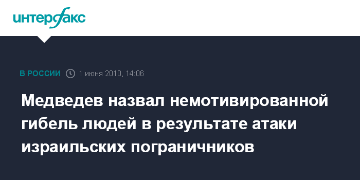 Москва. 1 июня. INTERFAX.RU – Гибель людей в результате инцидента с так называемым "караваном мира", следовавшим с гуманитарной миссией в Сектор Газа, является немотивированной и невосполнимой, заявил президент РФ Дмитрий Медведев. Он сказал, что нужно провести максимально тщательное расследование.