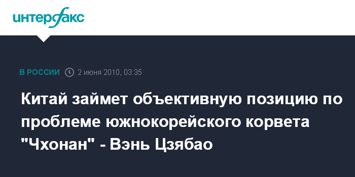 Пекин. 2 июня. ИНТЕРФАКС - Китай определит свою позицию по инциденту с корветом "Чхонан" ВМС Южной Кореи на основе объективных данных, заявил премьер Госсовета КНР Вэнь Цзябао в Токио.