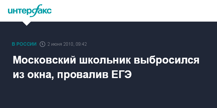 Москва. 2 июня. INTERFAX.RU - Шестнадцатилетний московский старшеклассник, неудачно сдавший накануне ЕГЭ, выпрыгнул из окна седьмого этажа и разбился насмерть, сообщил "Интерфаксу" источник в правоохранительных органах. По его словам, инцидент произошел поздней ночью на Пулковской улице д. №4.