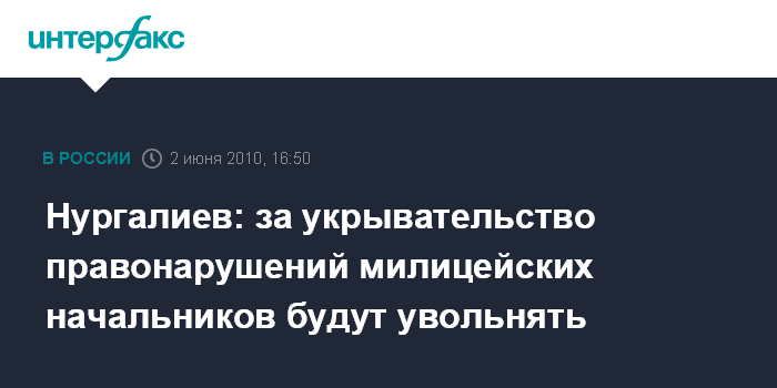 Москва. 2 июня. INTERFAX.RU - Глава МВД Рашид Нургалиев обещает увольнять руководителей органов внутренних дел за укрывательство правонарушений. "В новых условиях существенно возрастает персональная ответственность руководителей. Теперь за систематическое укрывательство правонарушений руководитель органов внутренних дел может быть отстранен от занимаемой должности и даже уволен", - сказал Нургалиев на заседании общественного совета при МВД в Москве в среду. По словам министра, соответствующий приказ уже готов.
