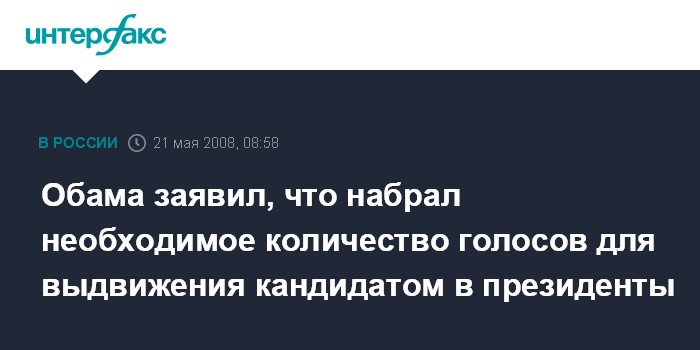 Москва. 21 мая. INTERFAX.RU - Кандидат в президенты США сенатор Барак Обама заявил, что он уже набрал большинство голосов простых членов Демократической партии, необходимых для официального выдвижения кандидатом в президенты США, сообщает The Wall Street Journal.