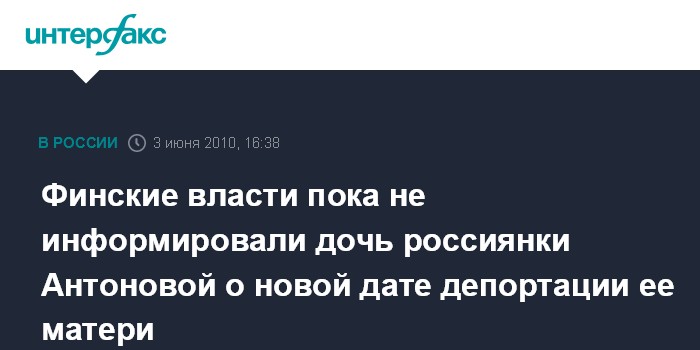 Москва. 3 июня. INTERFAX.RU - Дочь 82-летней россиянки Ирины Антоновой Наталья Кяярик заявила в четверг "Интерфаксу", что ей ничего неизвестно о новой дате депортации ее матери из Финляндии.