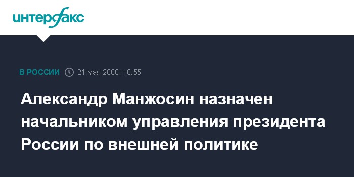 Москва. 21 мая. INTERFAX.RU - Президент России Дмитрий Медведев своим указом назначил Александра Манжосина начальником управления главы государства по внешней политике, сообщила пресс-служба Кремля. Должность начальника управления президента по внешней политике он занимал с апреля 2004 года.