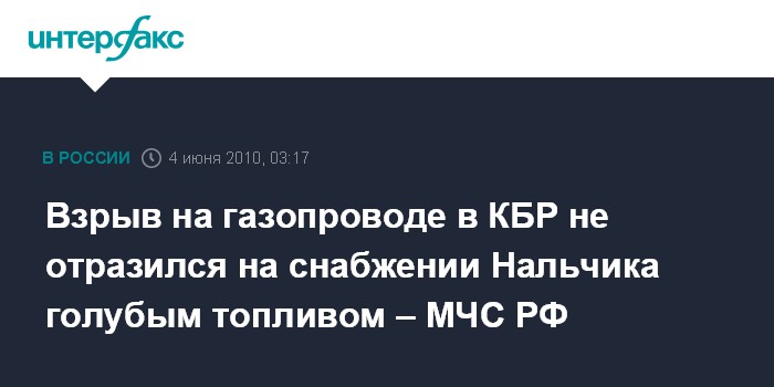 В свою очередь, в ЮРЦ МЧС РФ сообщили, что диаметр поврежденный трубы составляет 200 мм, давление - 22 атмосферы. При этом собеседник агентства отметил, что магистральные газопроводы, проходящие по Кабардино-Балкарии, в том числе Ставрополь - Грозный и Моздок - Невинномысск, не задеты. Взрыв произошел в пойме реки, на отводе газопровода местного значения", - уточнил источник агентства.