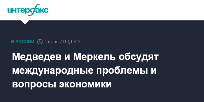 Москва. 4 мая. INTERFAX.RU – Перспективы продвижения в европейских политических структурах российской инициативы о заключении нового Договора о европейской безопасности (ДЕБ) и развития диалога Россия-ЕС будут обсуждаться в ходе встречи президента РФ Дмитрия Медведева с канцлером ФРГ Ангелой Меркель в рамках рабочего визита российского лидера в Германию 4-5 июня.