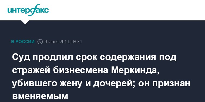 Москва. 4 мая. INTERFAX.RU – Врачи признали вменяемым бизнесмена Юрия Меркинда, расстрелявшего жену и двух дочерей из-за финансовых затруднений, сообщил его адвокат Фарид Кораблев.