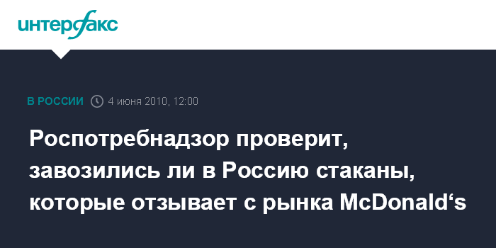 Москва. 4 мая. INTERFAX.RU – Роспотребнадзор проведет проверку по поводу того, завозились ли в Россию стеклянные стаканы в рамках одной из рекламных акций, которые компания McDonald‘s отзывает из-за содержания примеси токсичного металла кадмия.