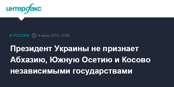 Москва. 4 июня. INTERFAX.RU - Президент Украины Виктор Янукович заявил, что признание Абхазии, Южной Осетии и Косово самостоятельными государствами нарушает международные нормы. "Я никогда не признавал ни Абхазию, ни Южную Осетию, ни Косово самостоятельными государствами. Это идет в нарушение международных законов и норм", - заявил Янукович в пятницу в Киеве на пресс-конференции, посвященной его 100 дням пребывания на посту президента.