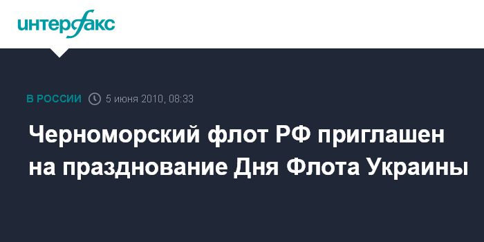 Севастополь. 5 июня. ИНТЕРФАКС-УКРАИНА - Командование военно-морских сил вооруженных сил Украины пригласило моряков Черноморского флота РФ принять участие в праздновании Дня Флота Украины, который будет отмечаться 4 июля, сообщили в пресс-службе командования ВМС Украины.