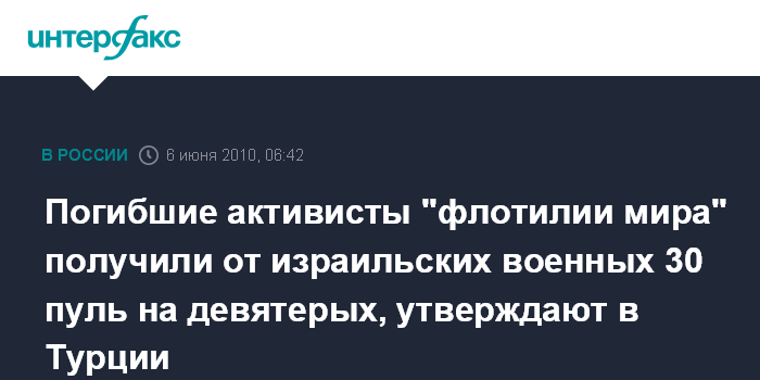 Лондон. 6 июня. ИНТЕРФАКС - Власти Турции заявили, что девять активистов "флотилии мира", погибшие во время штурма одного из судов израильскими военными на минувшей неделе, были убиты в общей сложности 30 пулями, передает британская телерадиовещательная корпорация Би-би-си.